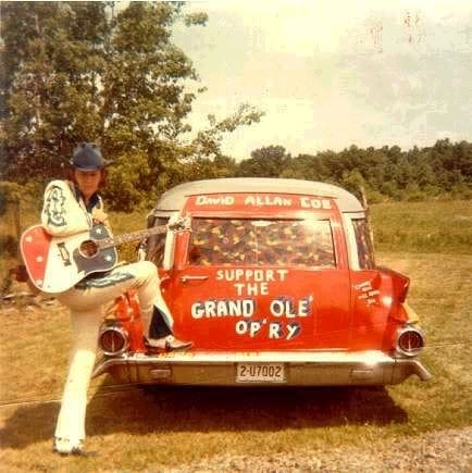 After getting out of prison in 1967, David Allan Coe moved to Nashville to pursue his country music career. He was homeless at the time, and lived in the back of a red Cadillac hearse that he parked regularly in front of the Ryman Auditorium—aka the “Mother Church of Country Music” where the Grand Ole Opry was conducted at the time. Crudely decaled to advertise the Opry, as the crowds came and went, there was David Allan Coe busking in front of the famed venue. It was his way of getting the attention of the industry. What was the result? It worked. Plantation Records recognized Coe and signed him to the label. Coe’s first two albums—Penitentiary Blues and Requiem for a Harlequin—were through Plantation, and that was the big break he needed. Later he singed with the major label Columbia Records.