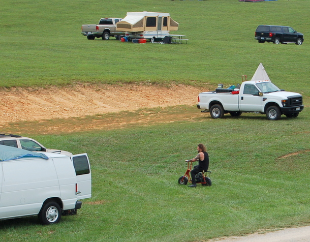 8/31 1:00 PM – HA! JB Beverly has been buzzing the campground in a Shriner-sized homade motorbike thingy with a cigarette dangling out of his mouth. Music starts in 1 1/2 hours!