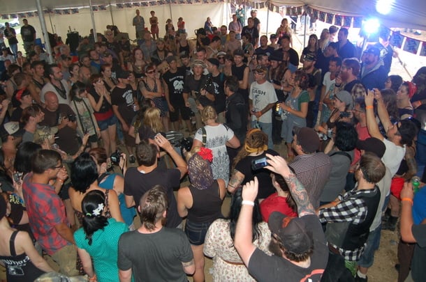 8/31 11:15 AM: Fans and vendors came streaming in all last night and now the grounds are beginning to fill up. Only a few of the choice camping spots in the shade of the tress are left. Folks are pumped for the music that will begin at 2:30 PM on Stage 2.