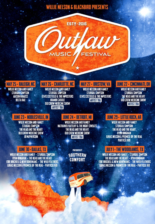 Primary headliner Willie Nelson will be joined by Sturgill Simpson on all dates except for one, with select dates also featuring Elvis Costello and the Imposters, Old Crow Medicine Show, Lukas Nelson and Promise of the Real, Alison Krauss, Brandi Carlile, The Head and the Heart, Delta Rae, Ryan Bingham, Edie Brickell, JD McPherson, and others, including some additions not yet announced on certain dates. Just like with the inaugural Outlaw Fest, the lineups offer fair discussion points on just what “Outlaw” means, but most of the acts are considered subsnative, even if they’re not Outlaw, or even country. See the full lineups below.