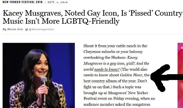 To this day, Craig Jenkins continues to assert that Saving Country Music lied, and mischaracterized the article in Vulture, but Vulture itself just doubled down, and then tripled down on the fact that the Craig Jenkins article was indeed declaring Kacey Musgraves’ Golden Hour the best country album in 2018. Vulture just underscored it, hyperlinked to it, and even make sure to eliminate all argument that may ensue about it by demanding, “Don’t fight us on that.” This is what transpired in an article posted on October 5th as part of Vulture‘s coverage of the New Yorker Festival where Kacey Musgraves performed called “Kacey Musgraves, Noted Gay Icon, Is “Pissed’ Country Music Isn’t More LGBTQ-Friendly“.