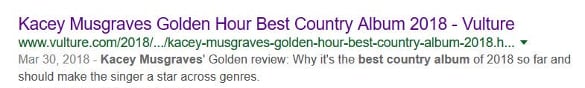 Here’s how the article is catalogued by Google and every other major search engine, with the URL, original title, and original subtitle clearly declaring Musgraves’ record the best in country in 2018.