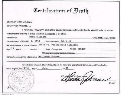 The Hank Williams Death Certificate