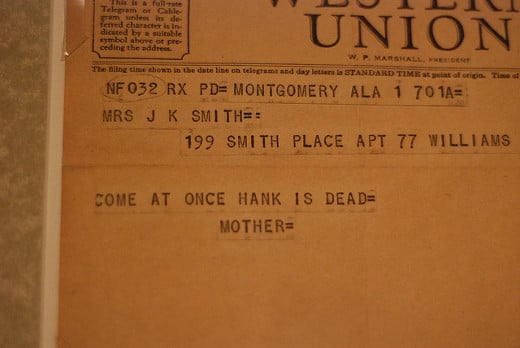 Telegram to Hank’s sister Irene from Hank Williams’ mother. Image from Letters of Note and Brian Bubonic.