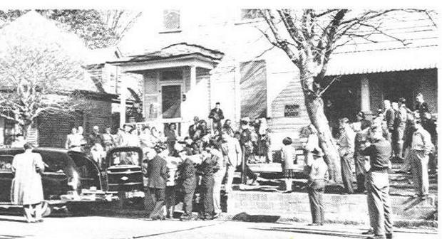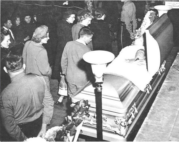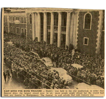 Hank Williams’ funeral was the largest in Montgomery, Alabama’s history. Over 25,000 people attended, but only 2,750 people were able to get into the Montgomery Municipal Auditorium to see Hank. The pictures below are from the Sevier County News. The first is of the funeral procession. The second is of Charles Carr, the driver during Hank’s “Last Ride” consoling Hank’s sister Irene.