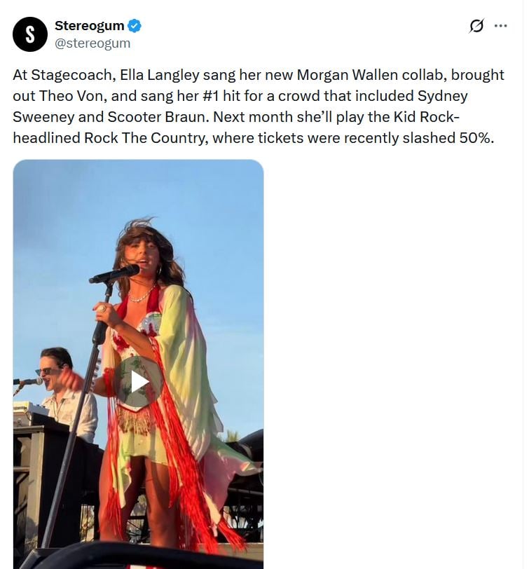 The Stereogum posts read, “At Stagecoach, Ella Langley sang her new Morgan Wallen collab, brought out Theo Von, and sang her #1 hit for a crowd that included Sydney Sweeney and Scooter Braun. Next month she’ll play the Kid Rock-headlined Rock The Country, where tickets were recently slashed 50%.”