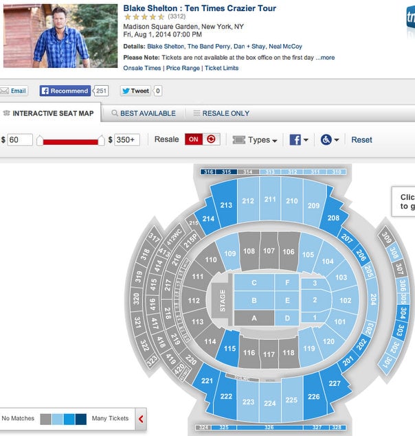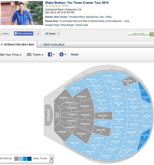 For example, a check of Ticketmaster for Blake Shelton’s August 1st show at Madison Square Garden shows many available tickets. Same can be said for his concert on October 4th at The Hollywood Bowl. As you can see from the ticket legends below, as of the posting of this article, many seats in multiple sections are still available for both shows.