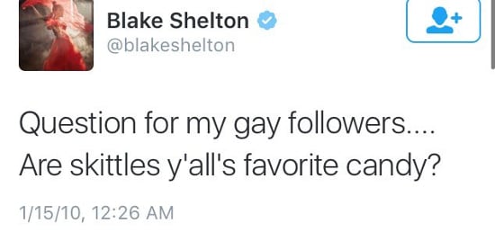 They didn’t take half a decade to surface; there was a similar controversy over them in 2011: http://www.huffingtonpost.com/2011/05/05/blake-sheltons-homophobic-tweet_n_858042.html