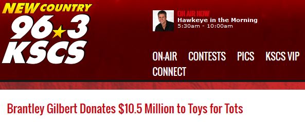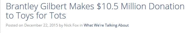 Did Brantley Gilbert make a donation to Toys For Tots? Yes he did. How much was it? We don’t know, but if it was anywhere north of $500,000, or 5% of what these headlines claim, I’ll eat my hat. I remember when Taylor Swift made a $4 million donation to the Country Music Hall of Fame, and how the size of it left all of our mouths agape. And we’re led to believe that Brantley Gilbert, Brantley Gilbert made a donation nearly 3 times this size to Toys For Tots? This would be one of the biggest celebrity donations in history.