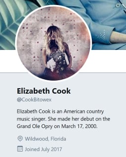 “[It] seems someone set up a fake acct under your identity/pic,” fellow artist Robbie Fulks warned Elizabeth Cook on Sunday, August 13th. “I’m getting weird DMs from it.” An account at @CookBitowex on Twitter with the same profile picture as the real Elizabeth Cook account has been reaching out to accounts with private messages, even without sending out any public tweets through the account. On August 6th, another impersonator account using a slight misspelling of Elizabeth Cook’s name was also active on Twitter before being targeted by fans and shut down.