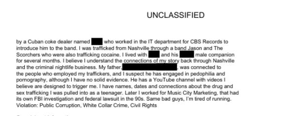 My next recruiter was a woman named [redacted], who worked with another recruiter [name redacted]. I became connected through [redacted] with the band Blues Traveler, and was approached by a Cuban coke dealer named [redacted] who worked in the IT department for CBS Records to introduce him to the band. I was trafficked from Nashville through a band Jason and the Scorchers who were also trafficking cocaine. I lived with [redacted] and his [redacted] male companion for several months. I believe I understand the connections of my story back through Nashville and the criminal nightlife business. My father [name redacted], was connected to the people who employed my traffickers, and I suspect he has engaged in pedophilia and pornography, although I have no solid evidence. He has a YouTube channel with videos I believe are designed to trigger me. I have names, dates and connections about the drug and sex trafficking I was pulled into as a teenager. Later I worked for Music City Marketing, that had its own FBI investigation and federal lawsuit in the 90s. Same bad guys, I’m tired of running.