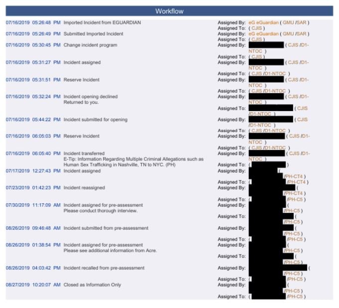 Then on July 22nd, 2019—or six days after the initial call—what appears to be the same woman called in again, though this can’t be verified since her name is redacted. The information from the second phone call gives more insight into how the woman might have ended up being trafficked.