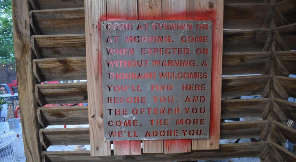 Even before you walk into the Listening Room, the outside feels so cozy with tables and art and the husk of an old covered wagon making you feel miles away from the madness of modern life.