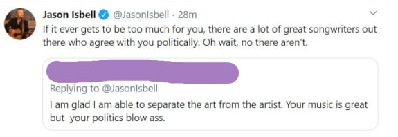 The original Twitter user that Jason Isbell was responding to was just voicing his political opinion, which he has a right to do, no different than Jason Isbell. But unlike Jason Isbell, the Twitter user was able to separate those political opinions from his evaluation of art—something that the Jason Isbell of 2020 appears to be completely unwilling or incapable of.