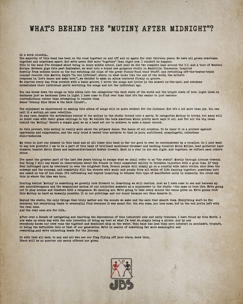 In any case, despite the motivations behind it the mutiny in the studio turned into a party. To categorize Mutiny is tricky, but many will no doubt come with their glass ceilings to try. We believe the term American Music pretty much says it all. And for all the big ideas behind the ‘Mutiny,’ there’s a simple goal we as a band set out to achieve: to make a dance record.So this protest, this mutiny is really more about the primary dance. The dance of all creation. To be clear it is a protest against oppression and suppression, and the only tried & tested true antidote to that is pure, unfiltered, unapologetic, relentless disco-hedonism