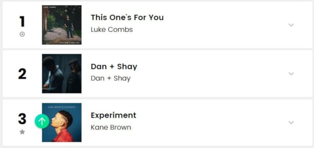 Checking the Billboard Country Albums chart, the week before the date change for Experiment occurred, the album was at #10 on the charts. The next week, Experiment had shot up to #3 on the Country Albums chart, and had a star beside it, denoting it as one of the greatest gainers on the chart (see below). This week—after the new release feature had ended—Experiment fell dramatically down in the charts to #9. PLEASE NOTE: The Billboard Albums chart runs a week behind the sales cycle, and Billboard also front dates their charts. However the boost seen on the charts would coincide with the featuring of Experiment by Spotify as a new release.