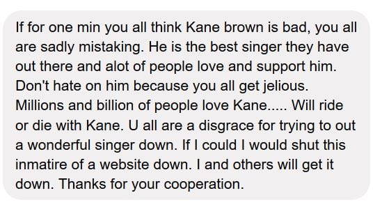 Judging by the spelling of some of those letters, Kane Brown/mainstream Country fans are very poorly educated. Not that that should surprise anyone…..