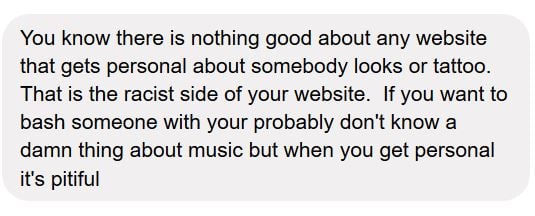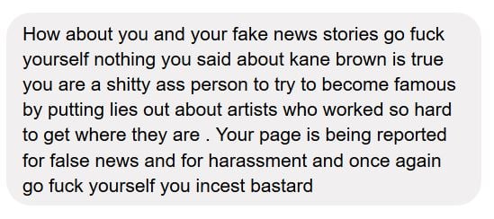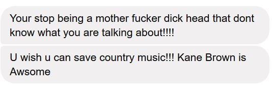 But regardless, in the interest of equal time and giving everyone a forum to voice their grievances, Saving Country Music has decided to post the six messages received from angry Kane Brown fans via the site’s Facebook page here. These aren’t fake, and these aren’t a selection of the messages. These are all the messages presented in order.