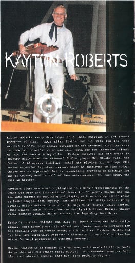 Born Kayton Author Roberts in Ona, Florida on November 25, 1933, Kayton started playing music around the age of 10 in his father’s country band, eventually leaving to perform in radio stations and local TV bands in Gainesville and Jacksonville. In 1964 Kayton Roberts received his first national recognition when fellow steel player Jerry Byrd recorded his song “Chime In” on his Admirable Byrd record.