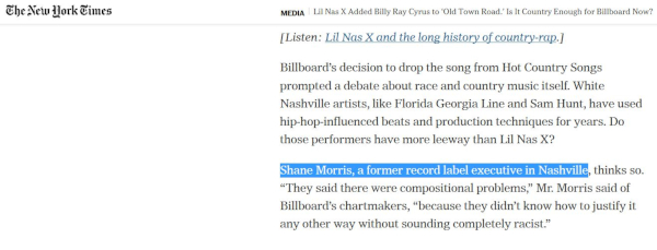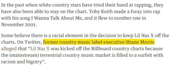 Not only did Shane Morris and his bad facts benefit from a complete lack of vetting from the press as they were publishing excerpts from his Twitter thread and links to his account which swelled his follower numbers and retweets, the press even embellished his role in the country music industry to bolster the importance of his revelations. Even though Shane Morris claimed only to be a “country music label person”—and this was a rather ambiguous title that could mean Shane simply handled social media posts for a certain label or was doing web development services in a contractor status—he was specifically cited in scores of articles on the Lil Nas X controversy as a “country label executive” by some of the biggest media outlets in the world, meaning he was being given credit for being top-level manager and decision maker in country music.