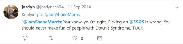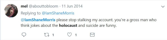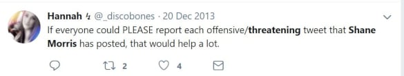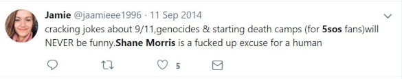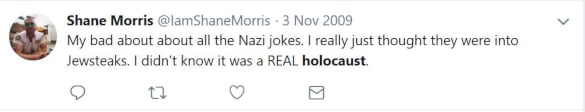 Though some of the tweets could be chalked up to humor in poor taste, they certainly are not the work of an upstanding individual, or someone who stands for social justice as Morris professes, or someone whose opinion should be taken seriously by the press. Shane Morris is a long-time aggressive Twitter troll who has used death threats and discriminatory language to attack music fans over many years, and then deletes the evidence shortly thereafter to avoid repercussions.