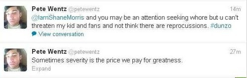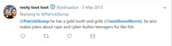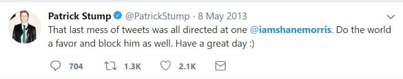 However at that point, Shane Morris had already deleted many of the threatening Tweets he sent to Patrick Stump, Pete Wentz, and their fans. But some were either screenshot, or rebroadcast by other Twitter users. A collection of the tweets can be found below.