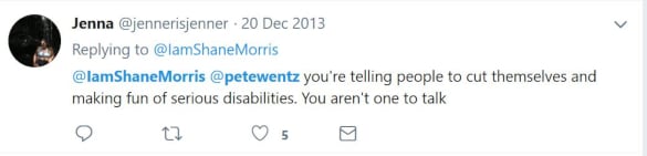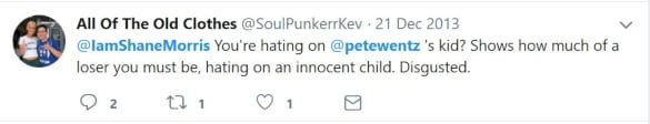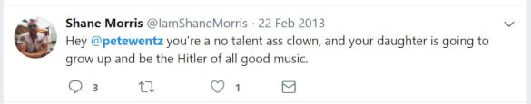 Pete Wentz also replied on Twitter to a Shane Morris tweet in 2013, saying, “…you may be an attention seeking whore but u can’t threaten my kid and fans and not think there are repercussions.”