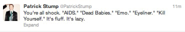 “You suck at heckling,” Patrick Stump said to Shane Morris on May 8th, 2013 on Twitter. “We could start with how none of your insults have contextual substance. You’re all shock. ‘AIDS.’ ‘Dead Babies.’ ‘Emo.’ ‘Eyeliner.’ ‘Kill Yourself.’ It’s fluff. It’s lazy.”