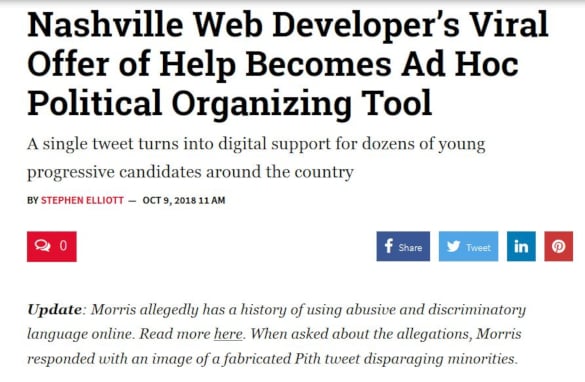 In a Nashville Scene article posted on October 9th, 2018 about Shane Morris’s offer to help potential progressive candidates with web design solutions, an update was added to the story that read, “Update: Morris allegedly has a history of using abusive and discriminatory language online. Read more here. When asked about the allegations, Morris responded with an image of a fabricated Pith tweet disparaging minorities.”