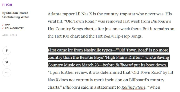 However this was completely untrue. As stated above, the first Saving Country Music article on the subject was posted five days after Billboard had made its decision (and happens to be based in Austin, not Nashville). In fact in the Saving Country Music article that Pitchfork linked to, it clearly states, “In the latest chart update, Billboard appears to have switched Lil Nas X and “Old Town Road” to the Hot Rap Songs chart. The song does not appear at all on Billboard’s Hot Country Songs chart dated March 23rd, and instead appears on the Hot Rap Songs at #24 with a ‘New’ tag slapped on it, meaning it’s a debut entry on the chart.”