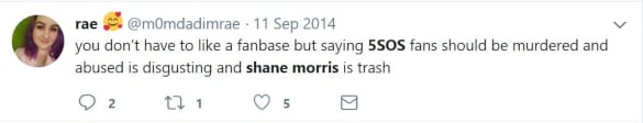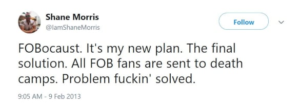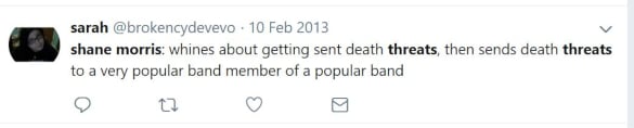 Though some of the tweets could be chalked up to humor in poor taste, they certainly are not the work of an upstanding individual, or someone who stands for social justice as Morris professes, or someone whose opinion should be taken seriously by the press. Shane Morris is a long-time aggressive Twitter troll who has used death threats and discriminatory language to attack music fans over many years, and then deletes the evidence shortly thereafter to avoid repercussions.