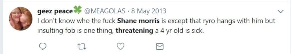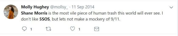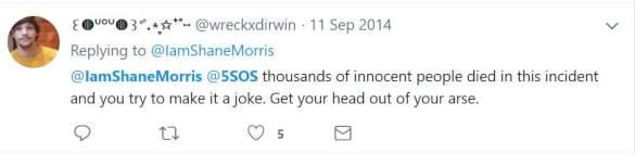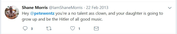 Though some of the tweets could be chalked up to humor in poor taste, they certainly are not the work of an upstanding individual, or someone who stands for social justice as Morris professes, or someone whose opinion should be taken seriously by the press. Shane Morris is a long-time aggressive Twitter troll who has used death threats and discriminatory language to attack music fans over many years, and then deletes the evidence shortly thereafter to avoid repercussions.