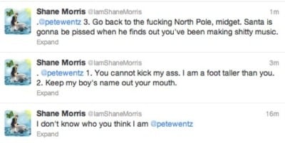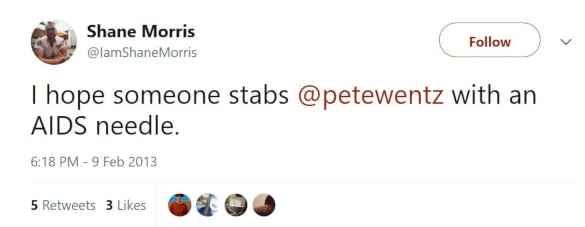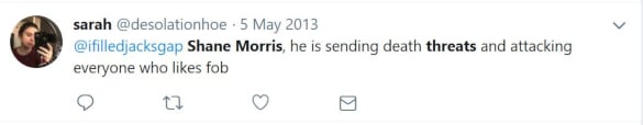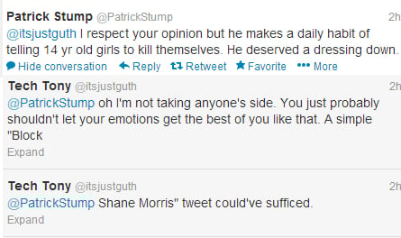 However at that point, Shane Morris had already deleted many of the threatening Tweets he sent to Patrick Stump, Pete Wentz, and their fans. But some were either screenshot, or rebroadcast by other Twitter users. A collection of the tweets can be found below.