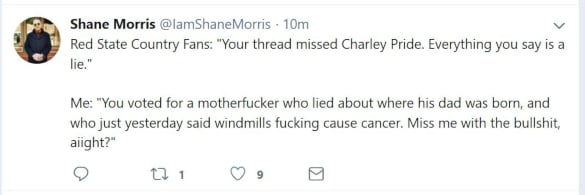 For Shane Morris’s part, when confronted about the incorrect information contained in many of his tweets that went on to make it into numerous media outlets—and specifically the incorrect claim that no African American had charted on Billboard’s Hot Country Songs chart until 2008—his reply was, “Red State Country Fans: “Your thread missed Charley Pride. Everything you say is a lie.” Me: “You voted for a motherfucker who lied about where his dad was born, and who just yesterday said windmills fucking cause cancer. Miss me with the bullshit, aiight?”