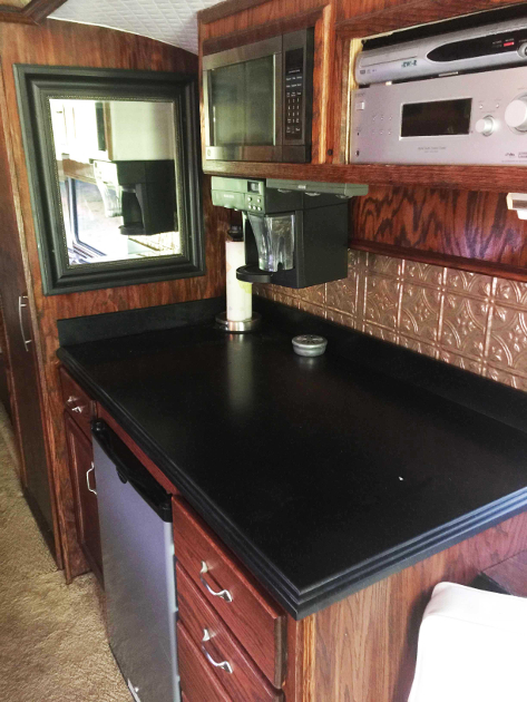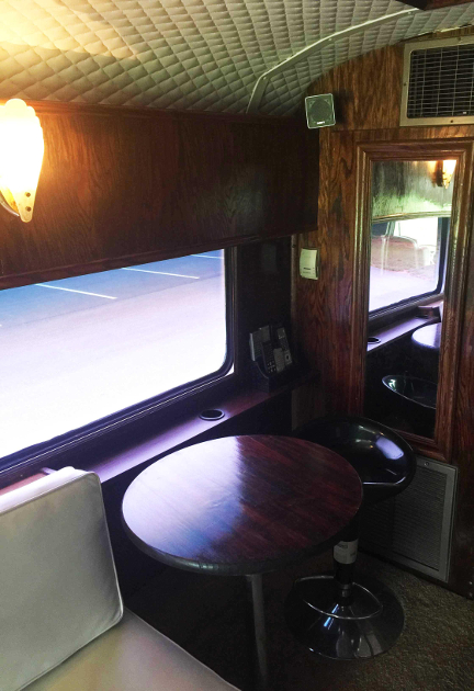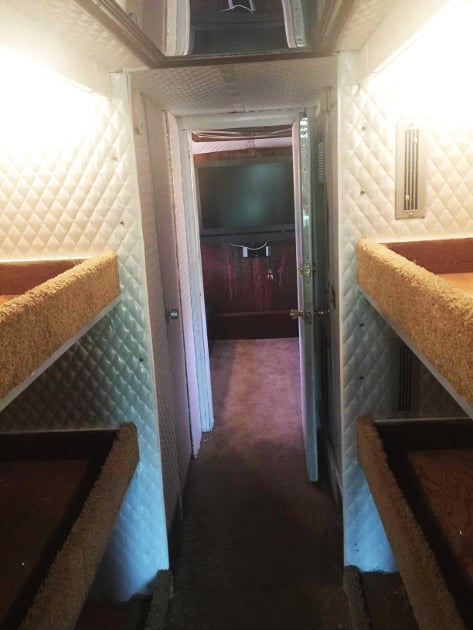 The bus Sleeps 8 or more, has a bathroom, 2 flat screen TV’s, a music system, 2 DVD players, microwave, surround speakers, 6 bunks, 1 private bedroom, air horns, refrigerator, 2 apartment-style air conditioners, and floor access panels to get to the top of the motor from inside the bus if ever needed.