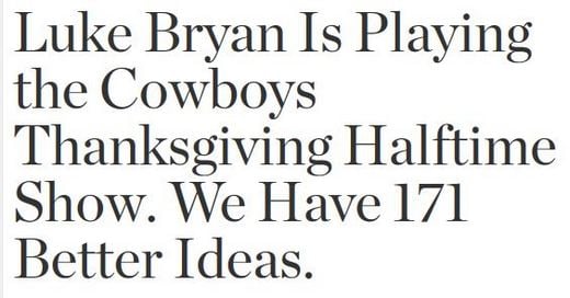 But I don’t blame Luke Bryan for his performance on Thanksgiving. The Dallas Cowboys hired Luke Bryan, and Luke Bryan is exactly who they got.