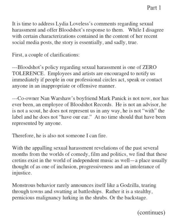 Alt-country singer and songwriter Lydia Loveless has come out with a statement saying that independent, Chicago-based insurgent country label Bloodshot Records did not properly address the behavior of an individual associated with the company who regularly sexually harassed and groped her during label functions over multiple years.