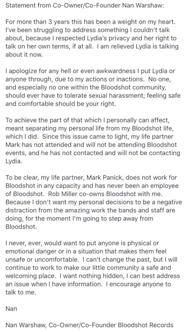 Bloodshot Records was founded by Rob Miller and Nan Warshaw in 1993, and Lydia Loveless claims it was Warshaw’s life partner Mark Panick who would commonly grope her and make sexually explicit remarks at label events at SXSW, at shows in Chicago, and other functions. After the revelations over the weekend, Nan Warshaw has announced she is stepping away from the company.