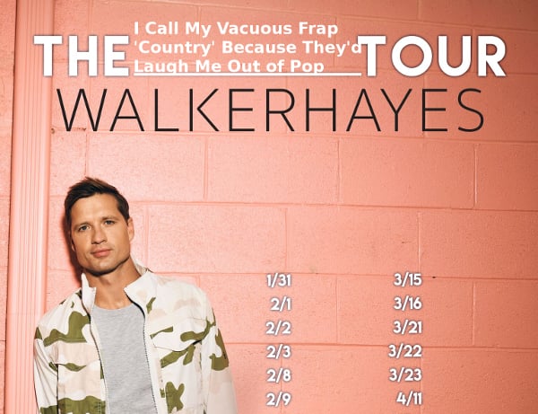 Bad pop star Walker Hayes recently infiltrated the mainstream country ranks after unleashing the terrible hit “You Broke Up With Me,” which Saving Country Music unilaterally declared the Worst “Country” Song Ever. Now this hack is going out on tour, and since he has no original thoughts of his own, Walker and his PR team have chosen to put the task of naming the upcoming tour in the hands of the unwashed masses.