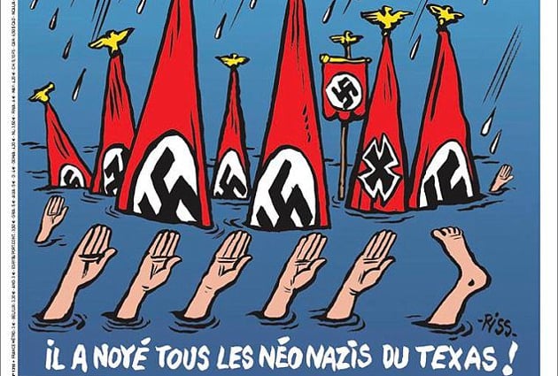 But that hasn’t stopped the misnomers and stigmas of Houston as a conservative mecca to be used a think-piece starters by political opportunists in the media and elsewhere. The legendary, and often controversial French comic Charlie Hebdo’s most recent issue depicts Hurricane Harvey’s survivors as Nazis—fueled by the idea that Nazi-istic behavior is on the rise in America, and a city like Houston would certainly be a bastion of such hatred and subversive activity as a major population base in Texas.