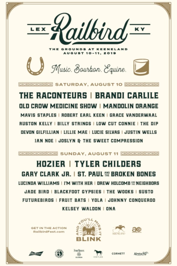 This is not your average field festival. Just like many of the new festivals sprouting up around the country, Railbird will specialize in a host of VIP and Premium packages that will include special perks, with numerous chefs on site preparing curated meals, as well as other exclusive premier parties and afterparties. There will also be plenty of equine-themed events and experiences for those who wish to partake, as well as plenty of emphasis around one of Kentucky’s other well-known commodities—Bourbon. In fact the tagline of the new fest is “Music. Bourbon. Equine.”