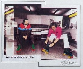 Photograph of Waylon Jennings and Johnny Cash Rollerskating. $750