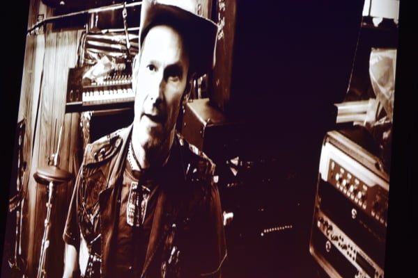 8:10 – Vintage footage of Rosie Flores, Dwight Yoakam, The Stray Cats, Big Sandy and His Fly-Rite Boys and others is playing in montage form on the big screen. The crowd goes crazy each time another vintage great is shown.