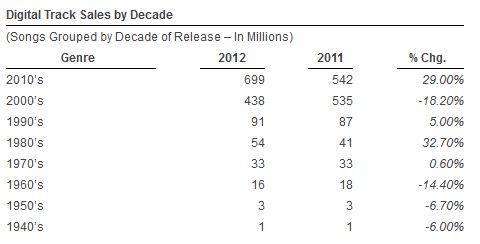 The popularity of 80’s music is corroborated by two additional points of data outside of the Cornell study: 1) The presence of 80’s-influenced elements in present-day music, and 2) The sales spike of 80’s music. The below chart from Soundscan for total music sales in 2012 shows a dramatic spike in appeal for 80’s music, increasing 32% last year—higher than for any other decade.