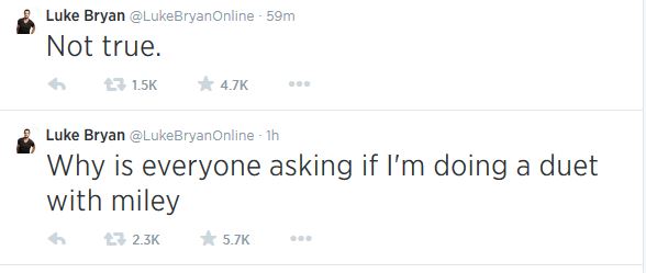 (6-18-2014 2:25 PM CDT): According to Luke Bryan, there is no Miley Cyrus duet coming. On Wednesday, Luke posted via Twitter, “Why is everyone asking if I’m doing a duet with miley. Not true.” As reported below, NASH’s America’s Morning Show co-host Chuck Wicks had reported Luke Bryan and Miley Cyrus were had a duet in the pipeline, and the rumor was later “confirmed” by radio personality Blair Garner (read confirmation tweet). Read more below.