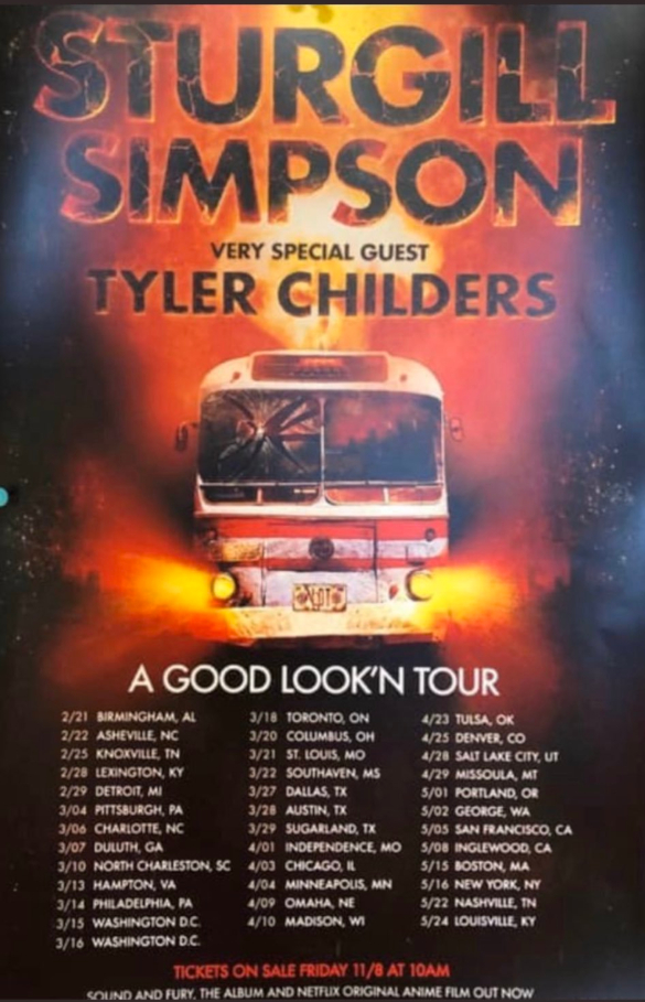 Fans have been running down posters that are popping up at venues and prominent places in cities where Sturgill and Tyler will be playing in 2020, even though the dates at this point haven’t been officially announced. Fans have been posting pictures of the posters on Instagram, on Twitter, and other social media. Then on Sunday (10-27), posters promoting an entire tour called “A Good Look’n Tour” began to pop up with all the dates and cities named, and with the information that tickets will go on sale November 8th at 10:00 a.m. local time.