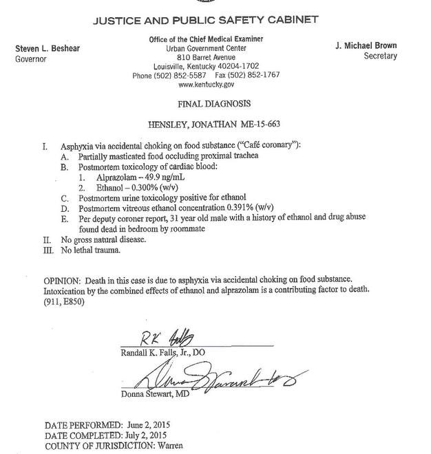 Jon Hensley choking to death because he was heavily intoxicated and heavily medicated beyond a prescribed dosage at the same time is not my opinion, and I never called myself an expert. That was the findings of Dr. Randall Falls and Dr. Donna Stewart who are experts, and concluded in the autopsy report, and I quote, “Intoxication by the combined effects of ethanol and alprazolam is a contributing factor to death.”