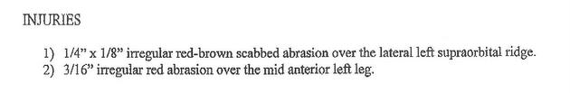 - 1) 1/4″ x 1/8″ irregular red-brown scabbed abrasion over the lateral left supaorbital ridge.