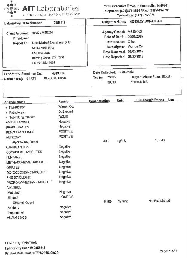 The reason I posted this autopsy is because Jessica Blankenship of the Lexington Country Music Examiner, as well as many others, purposely lied to the public about the nature of Jon Hensley’s death, and purposely lied about how I was the origination point about the rumor that he had died of a drug overdose. Not only can anyone read that drugs were in fact involved from the autopsy report, and verify this through 3rd party governmental sources, I NEVER said, publicly or privately, that Jon’s death involved drugs before the autopsy report was released. Furthermore, high profile individuals and artists demanded that I post about Jon’s autopsy, because they had been lied to, and believed drugs weren’t involved. Many of those people have since apologized to me after they discovered the true nature of Jon Hensley’s death, and the motivations behind those who tried to cover it up and place the blame on me.