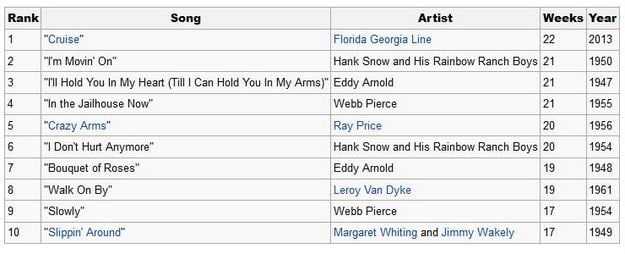 Billboard and the echo chamber that is much of the entertainment media/blogosphere made much hoopla last week over Florida-Georgia Line’s “Cruise” breaking the all-time record for weeks at #1 on the Hot Country Songs chart. With 22 weeks and counting atop the Billboard Hot Country Songs chart, “Cruise” surpassed the 21-week totals accumulated by Eddy Arnold’s “I’ll Hold You in My Heart (Till I Can Hold You in My Arms)” in 1947-1948, Hank Snow’s “I’m Moving On” in 1950, and Webb Pierce’s “In The Jailhouse Now” in 1955. Although Billboard acknowledges that this happened because of its new chart methodology (introduced in October 2012) incorporating airplay from all genres, paid digital download sales, and streaming into chart rankings for its genre-specific Hot Songs charts, it has failed to acknowledge how much this new chart record misrepresents the real impact of “Cruise” compared to other big country hits.